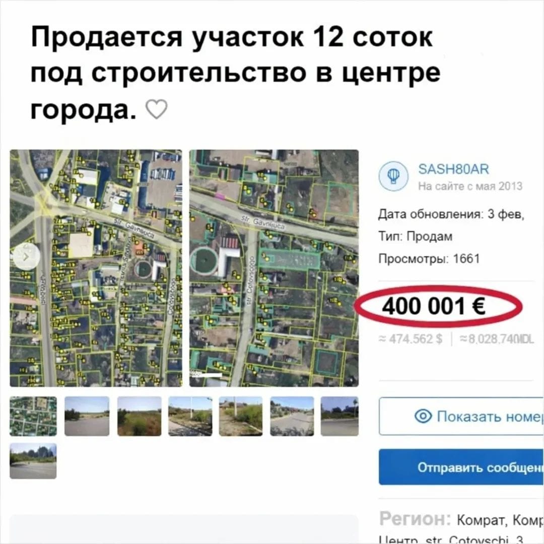 «Я думал, что видел всё» — риелтор в Комрате возмущён ценой участка под многоэтажку: 12 соток продают за 400 тысяч евро.