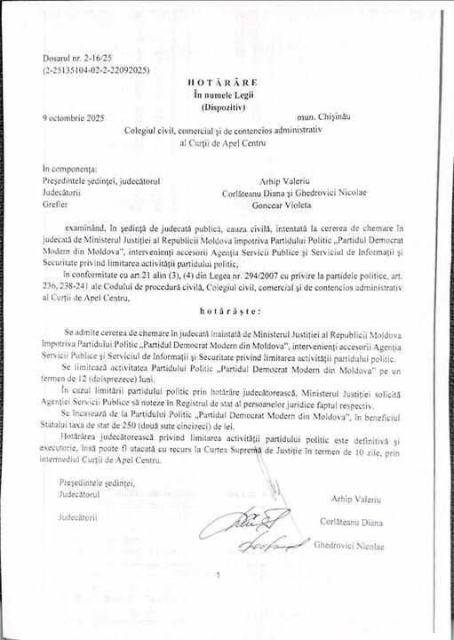 Деятельность Современной демократической партии Молдовы (PDMM) ограничена на один год. Такое решение приняла Апелляционная палата сектора Центр, которая полностью удовлетворила иск, поданный Министерством юстиции.