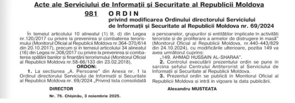 СИБ Республики Молдова обновила перечень лиц, субъектов и других групп, вовлеченных в деятельность по распространению оружия массового уничтожения. На позицию №149 был внесен президент Сирии Ахмед Хусейн аш-Шараа.