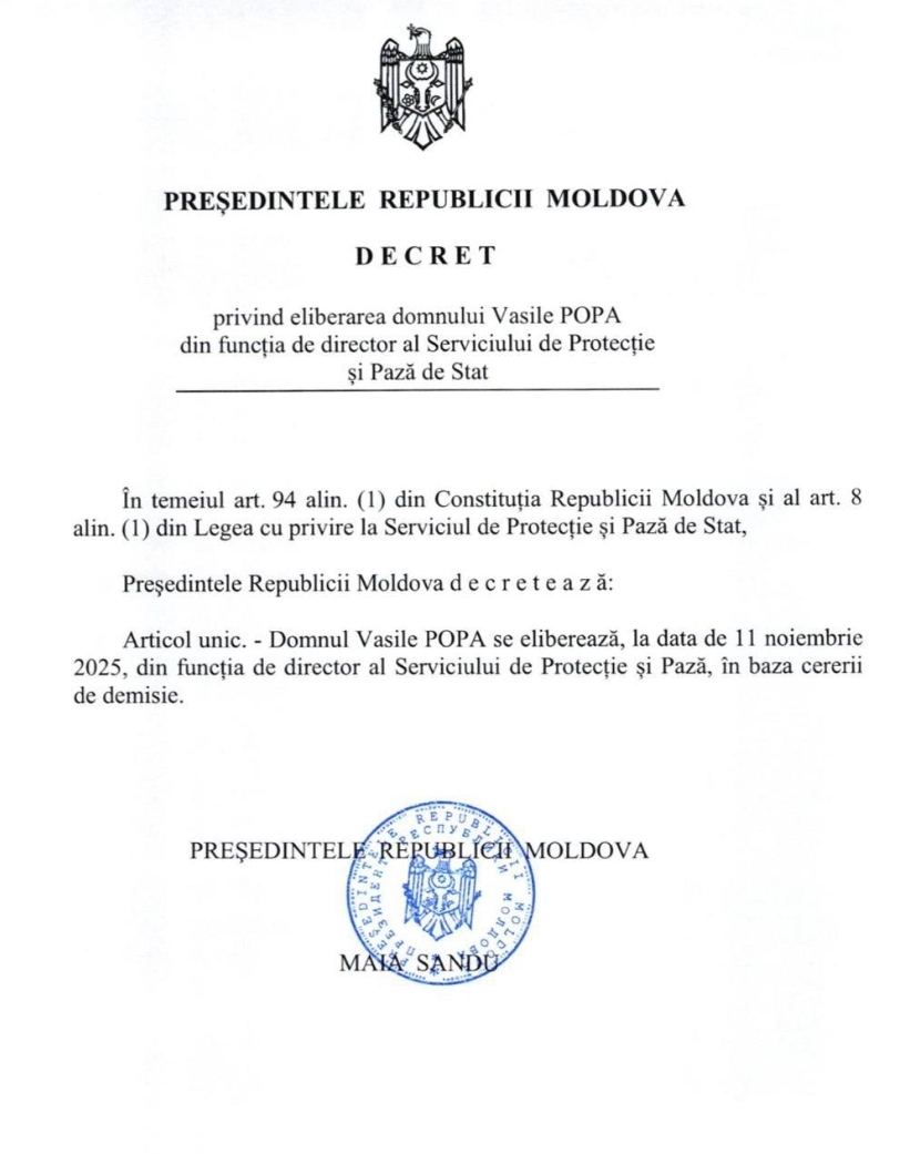 Согласно опубликованным документам, Василий Попа освобожден от должности главы SPPS с 11 ноября 2025 года на основании поданного им заявления об отставке.