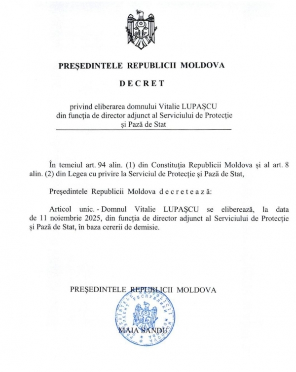 Тем же президентским указом Виталий Лупашку освобожден от должности заместителя директора того же учреждения, также по собственному желанию, начиная с той же даты — 11 ноября 2025 года.
