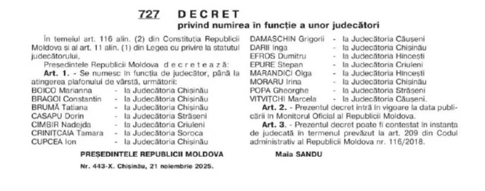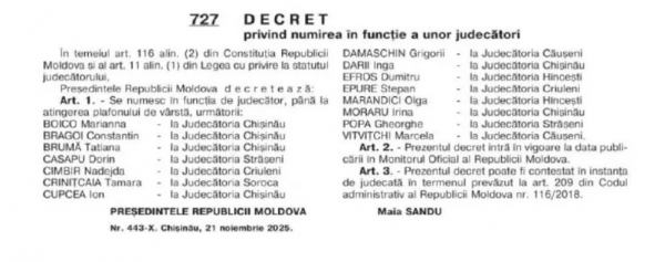 Президент Республики Молдова Майя Санду утвердила назначение 15 новых судей указом от 21 ноября 2025 года.