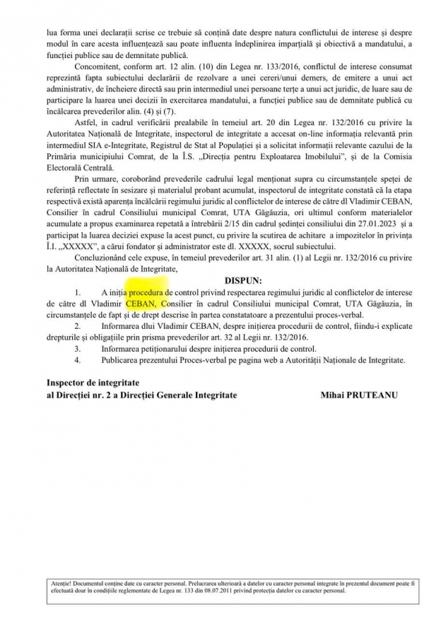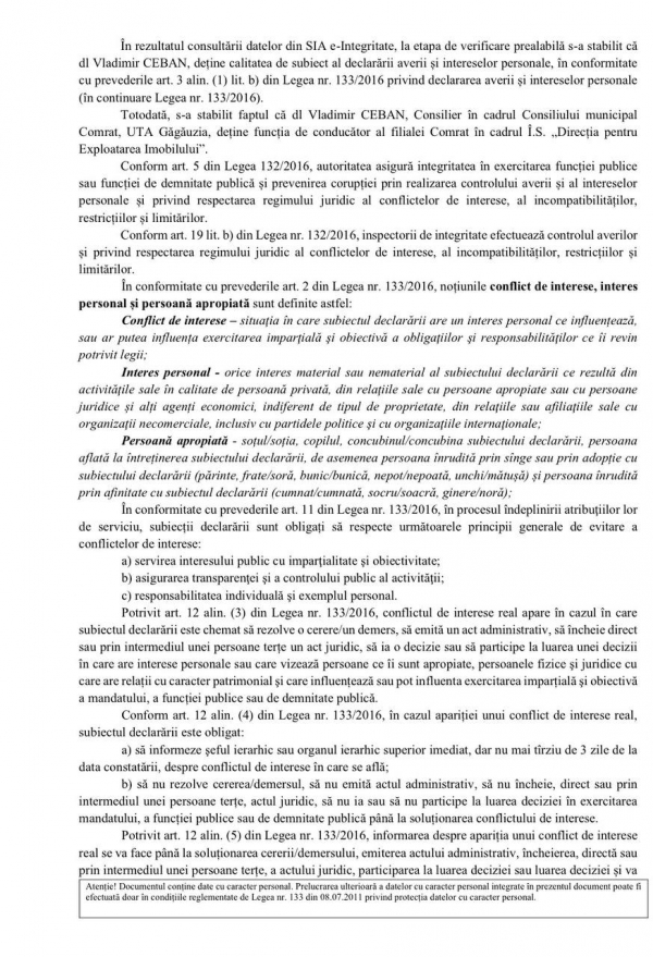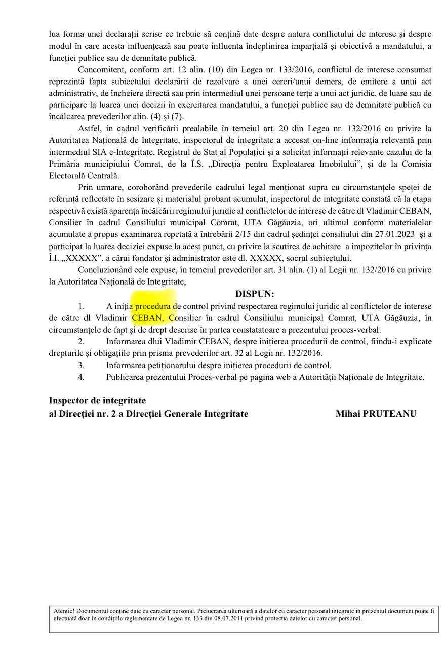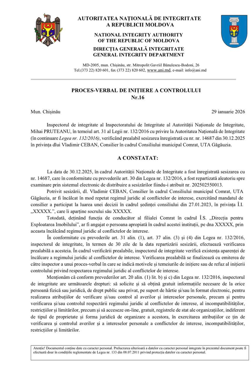 Национальный орган по вопросам добросовестности (ANI) инициировал проверку по факту конфликта интересов в отношении муниципального советника из Комрата Владимира Чебан.