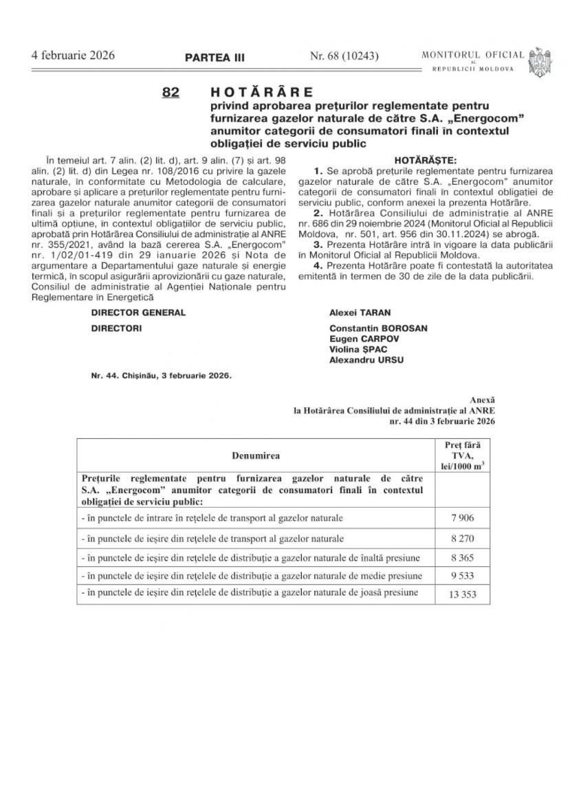 Постановление о новых тарифах опубликовано в сегодняшнем выпуске Monitorul Oficial.