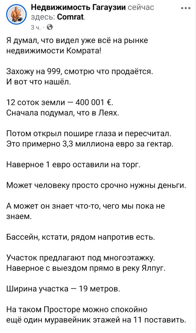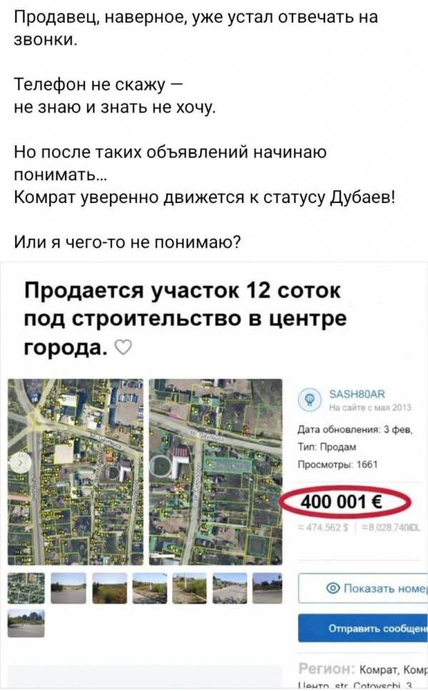 «После таких объявлений начинаю понимать... Комрат уверенно движется к статусу Дубая! Или я чего-то не понимаю?» — возмутился риелтор.