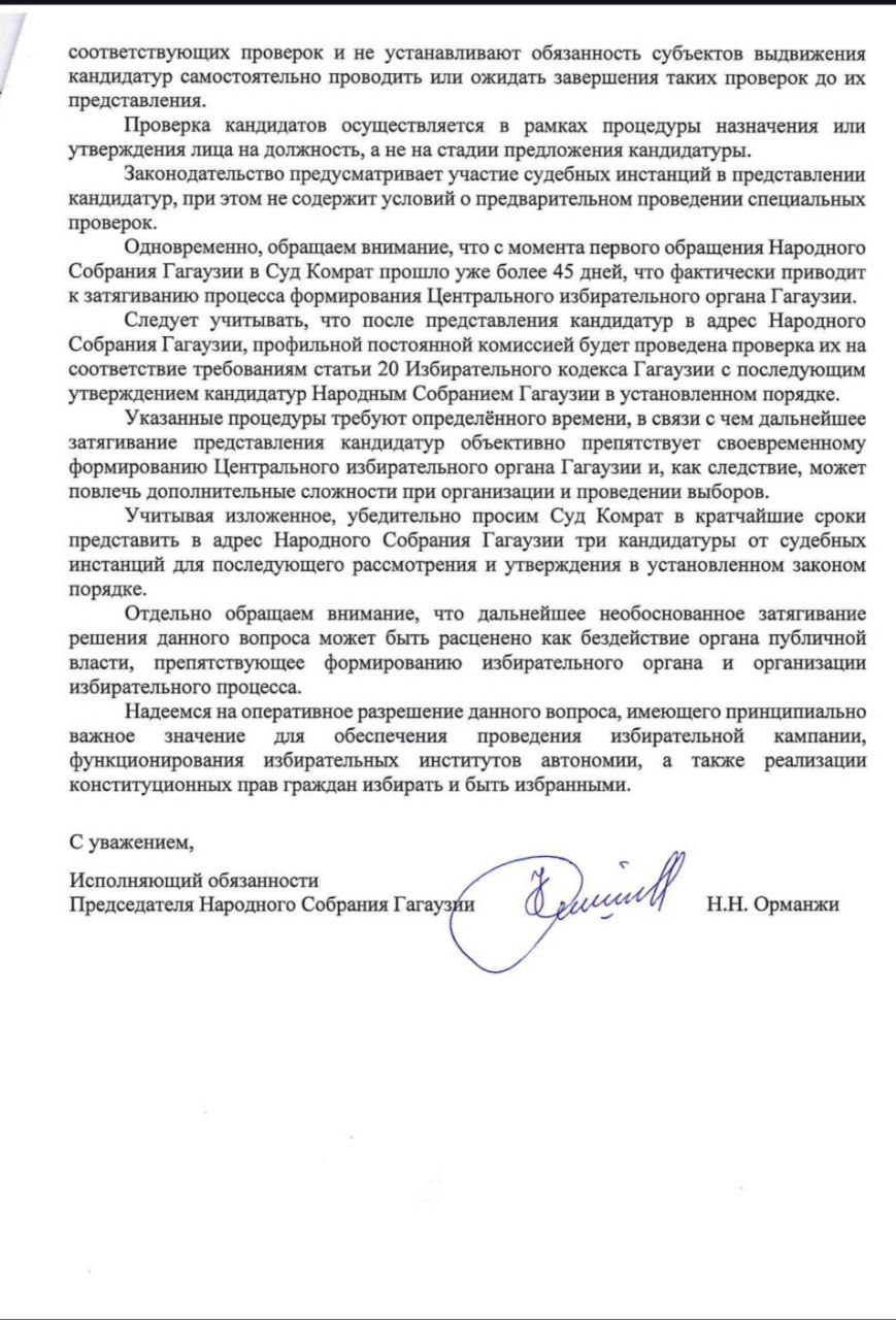 «Дальнейшее затягивание представления кандидатур объективно препятствует своевременному формированию Центрального избирательного органа Гагаузии и может повлечь дополнительные сложности при организации и проведении выборов», — говорится в обращении.