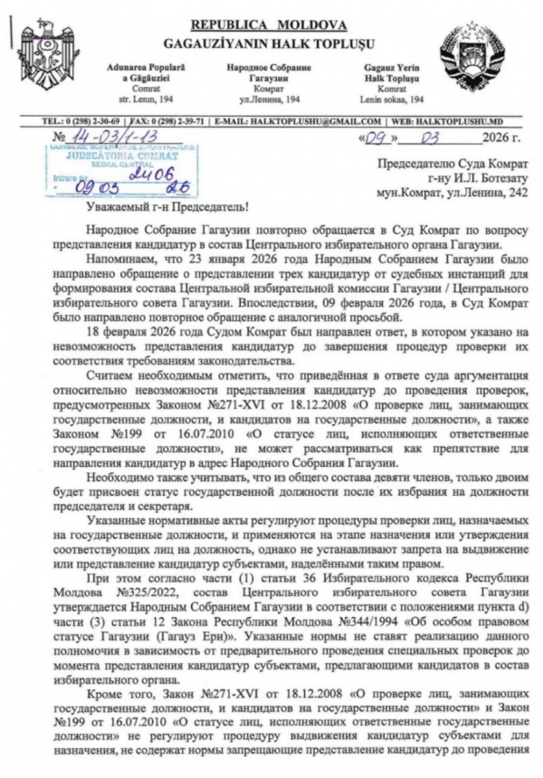 Народное собрание Гагаузии повторно направило обращение в адрес Суда Комрат с просьбой в кратчайшие сроки представить трёх кандидатов в состав Центральной избирательной комиссии автономии.