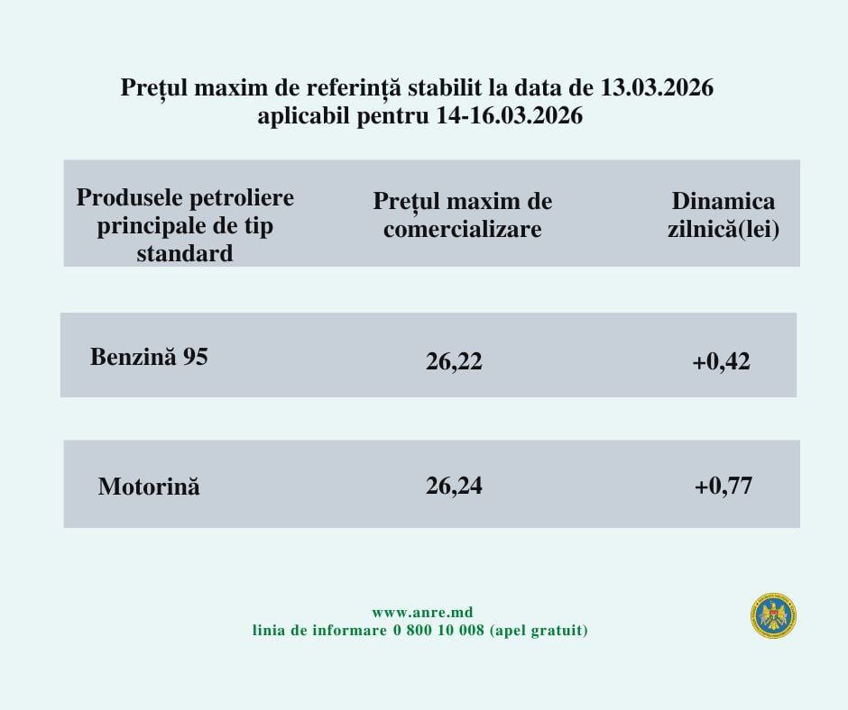 Таким образом, бензин подорожает на 42 бана и будет стоить 26,22 лея за литр, а дизельное топливо вырастет на 77 банов до 26,24 лея за литр.